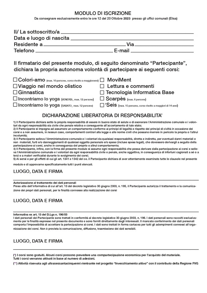 Modulo di iscrizione da recapitare al Coune di Forni di Sopra